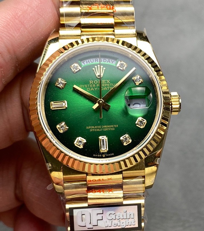 Day Date 128238 Gain Weight YG QF 1:1 Best Edition Green Dial Diamond Markers on YG President Bracelet > SHOP