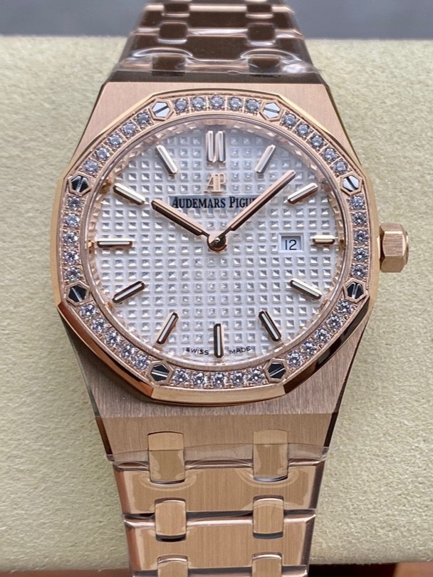 Lady Royal Oak 33mm 67651 Diamonds Bezel RG ZF 1:1 Best Edition White Textured Dial on RG Bracelet RONDA Quartz > SHOP