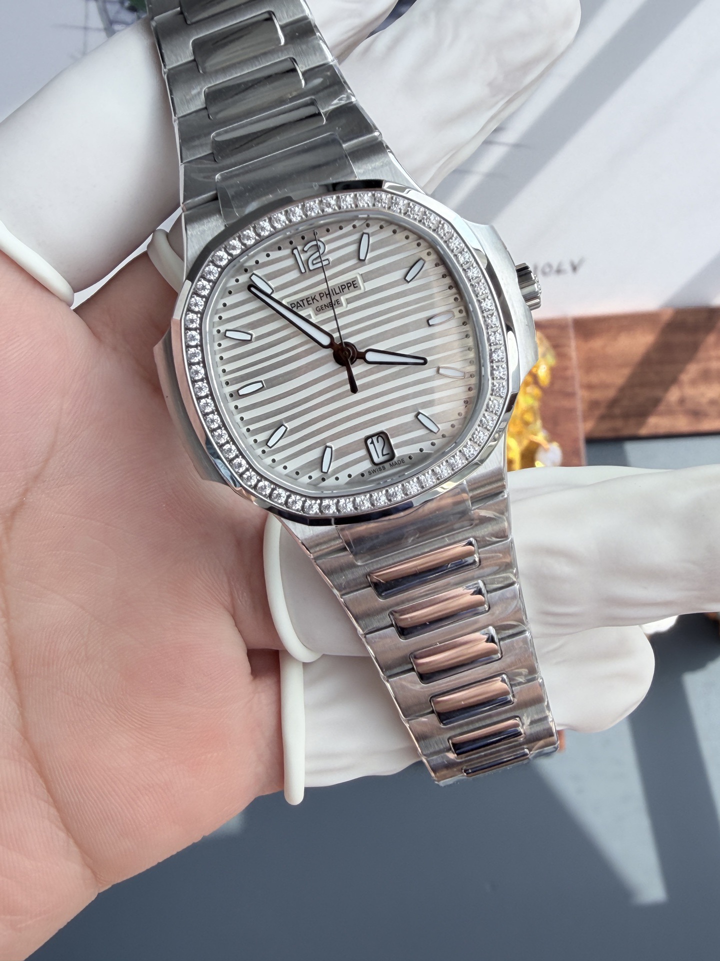 NAUTILUS 7118 LADIES SS DDF 1:1 BEST EDITION WHITE DIAL DIAMONDS BEZEL ON SS BRACELET DD324 SUPER CLONE